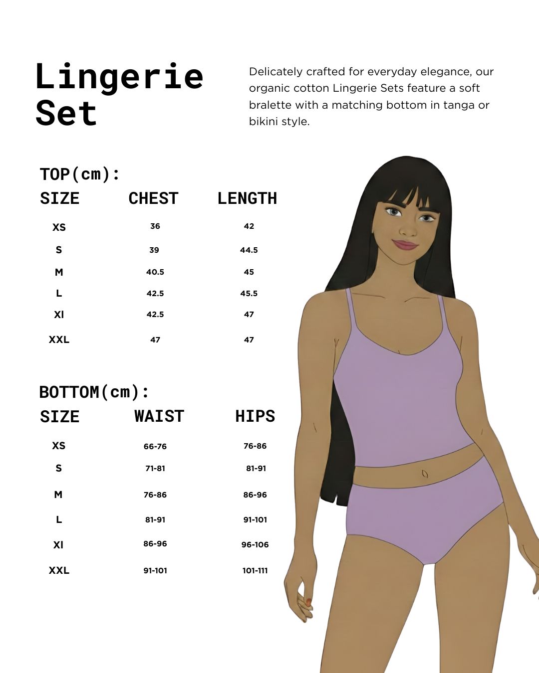 A perfect blend of elegance and ease, the Garnet Lingerie Set features a chic bandeau-style bralette paired with a classic bikini bottom. Crafted from breathable, eco-friendly fabric, it is designed for all-day comfort with a touch of luxury. This set embraces your natural shape while keeping you effortlessly stylish—ideal for lounging, layering, or everyday wear.