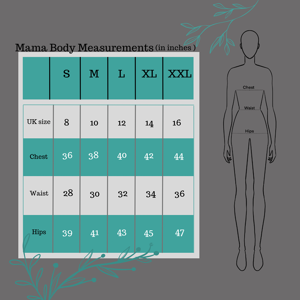 Making mother feel beautiful, this soothing yellow dress is made with handloom cotton fabric and dyed with chemical free azo free dyes. They will keep you uplifted with their soft fabric and the colourful shrim hand embroidery is sure to make you and the little one smile. The front bottons will easily give access to nursing whenever you and the baby want and the cut is such to accommodate the growing belly when the little ones is there kicking for space. We take utmost care in the selection of our fabric and the stitching technique to ensure maximum comfort and style.