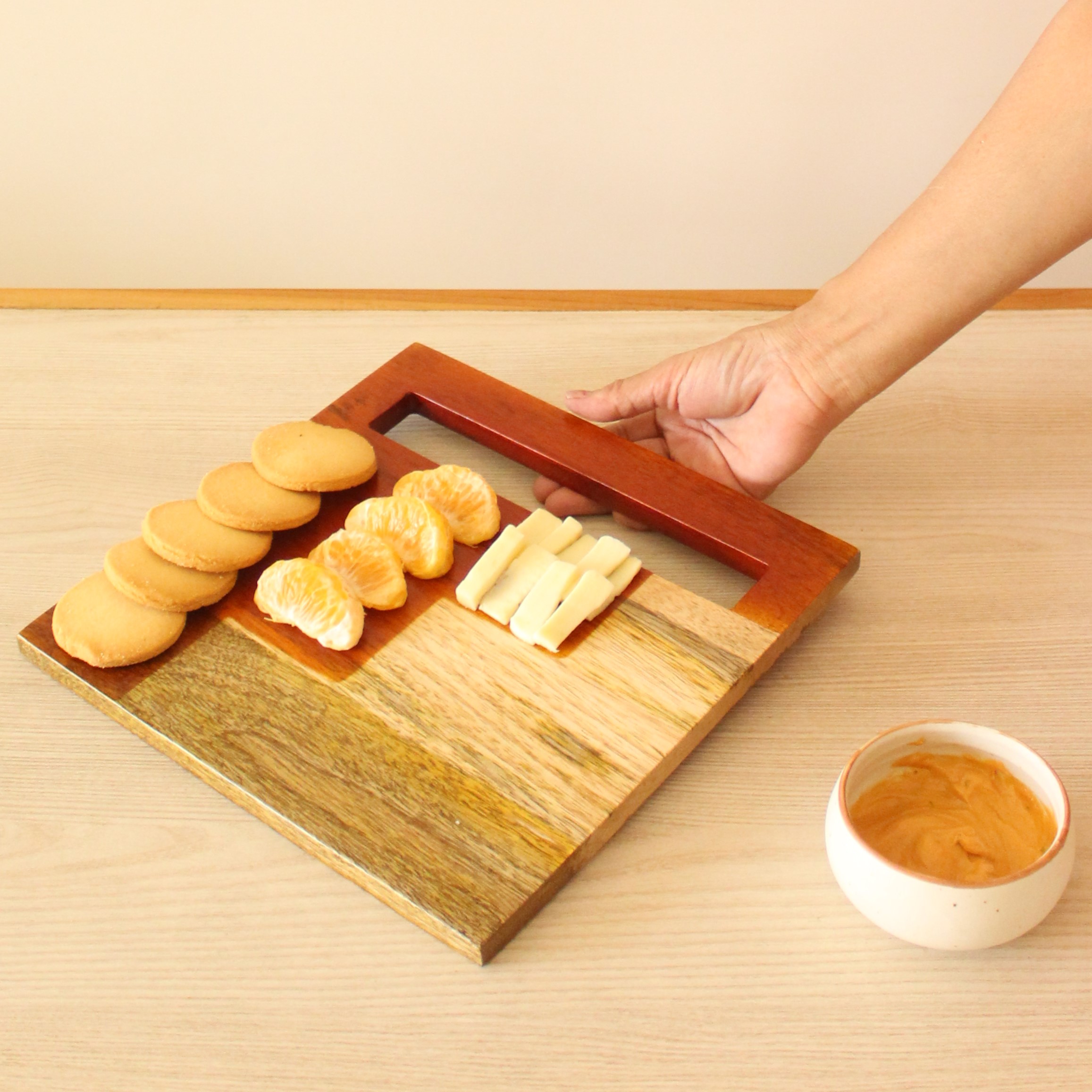 A cheese platter is an ideal starter for any gathering, and this one can become a fruit platter for high teas, chinese platter for get-togethers, dessert platter for game nights, making your hosting easy! This staircase wooden platter has an exclusive design of a handle carved within the platter, making lifting and serving easy.