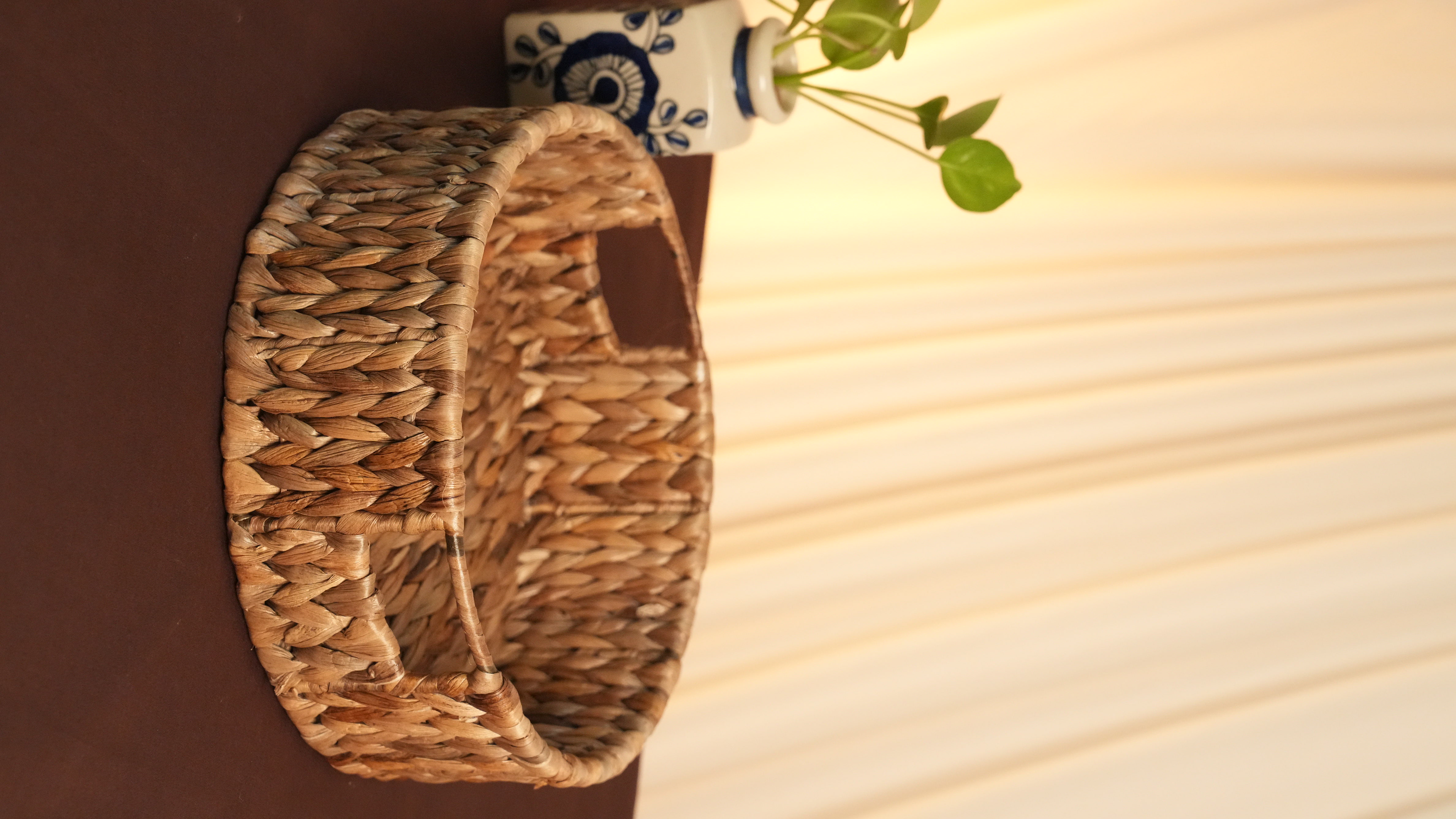 Crafted beautifully from handwoven water hyacinth, this round tray brings together rustic charm and modern durability. Its tightly woven natural fibers give it a warm, earthy texture, while the sturdy metal frame adds structure, strength, and a refined finish. Perfect for serving guests, styling your centre table, organizing counters, or creating a cozy décor corner—this tray is as functional as it is aesthetic. Lightweight yet durable, it blends effortlessly with any home style while supporting sustainable craftsmanship. A timeless piece that elevates everyday living with simplicity, nature, and elegance.